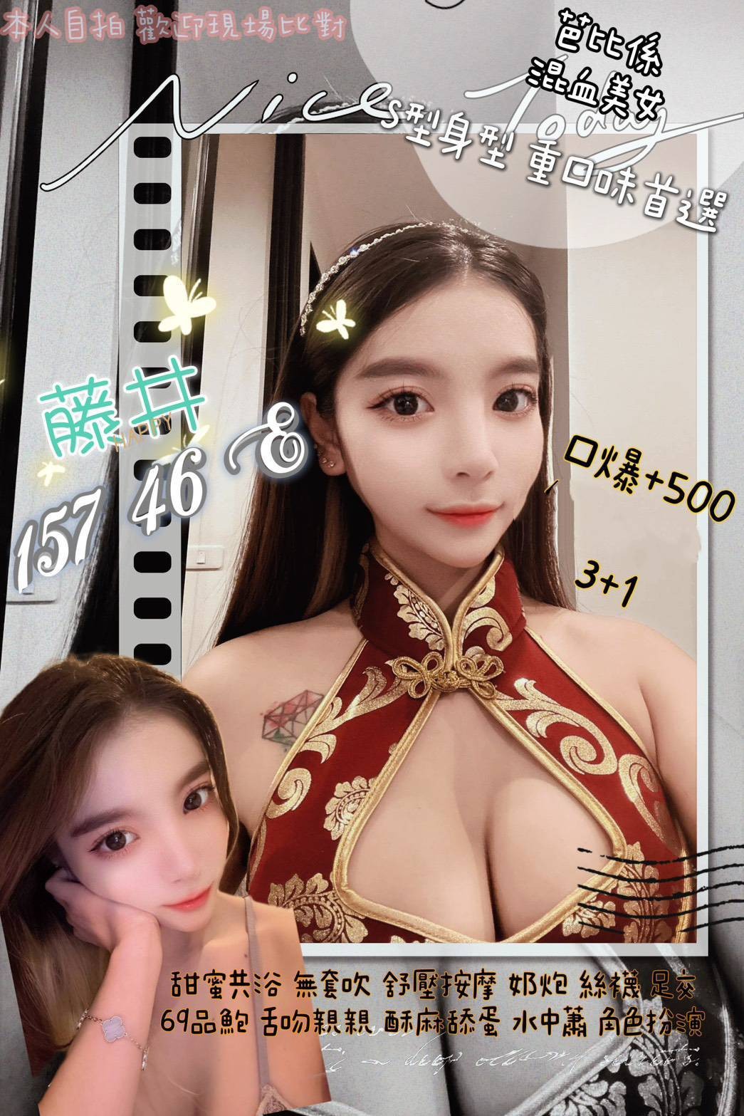 ☑️無套吹 ☑️Kiss☑️舌吻☑️前後澡 ☑️按摩 ☑️胸推 ☑️絲襪 ☑️品鮑☑️舔蛋☑️奶泡☑️69☑️水中蕭